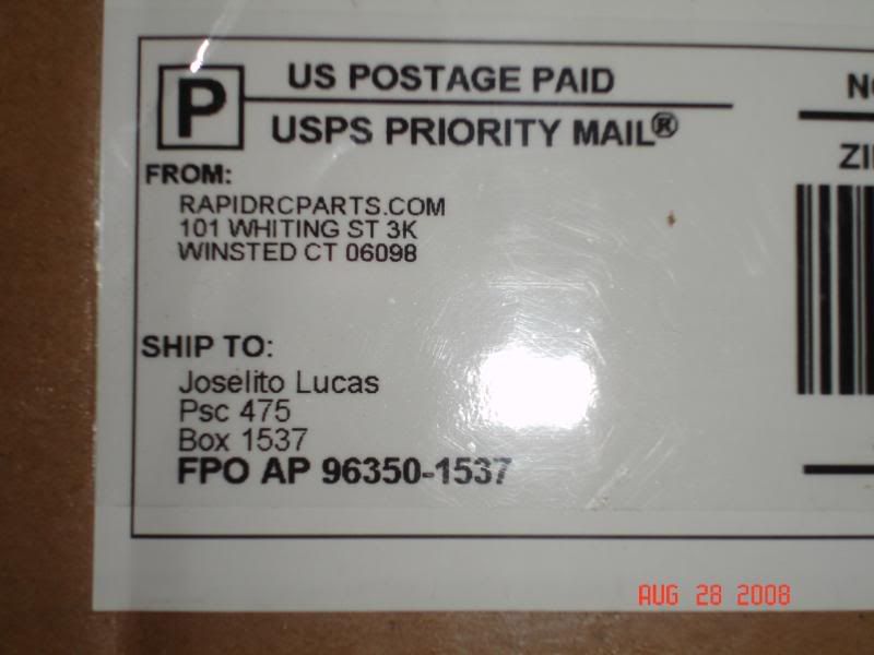 Unfortunately, it does not work that way in the US military. Our packages do not go through Japanese customs because the Military bases outside the US are considered part of the continental US for mailing and shipping purposes. We don’t pay any customs duties or fees. That’s the main advantage of military mail system. The US Navy has itsr own postal clerks that do the job of regular post office employees. Our packages and mail are shipped to the San Francisco Post Office for distribution to the different bases/commands in the Pacific region. For mainland Japan, the mails and packages leaves San Francisco via air to the Yokohama Mail distribution Depot for further distribution to the different bases. To add insult to injury, I just received a package containing revo parts I bought from an ebay seller located in Winsted, CT. It was shipped USPS Priority on Aug 18, 2008. Here are some pics: http://i256.photobucket.com/albums/h...Picture028.jpg http://i256.photobucket.com/albums/h...Picture029.jpg That’s about 9-10 days and CT is farther from San Francisco than Kansas :no::no::no::no:. |