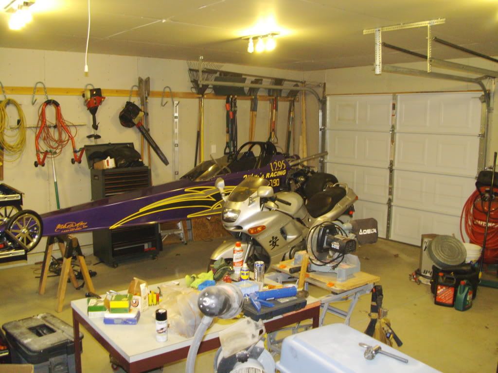 Hey BB16 nice little shop there. All the basic needs and some cycle toys to play with in between projects. What a life??? I wish that I could have that kind of space again. When I sold my propery in FLorida in 2004 I had built a 20 X 20 shed in the backyard for a shop, but never got it finished, so I have to sue my 2 car garage and it worked fairly well. You have everything you need in there for doing just about anything. I like the hydraulic press. :lol: