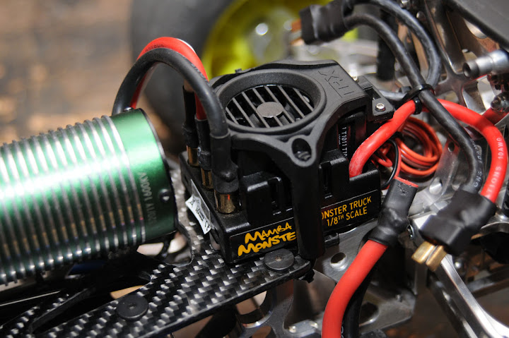 Caps got loose and shorted it out... Also... my new Lipos are finally here... I am now running the truck on Turnigy 40c, 4000mah 2s and 3s... I am loving this new power combination... I did notice that the Quark was still much smoother on slow starts than Mamba Monster... On roll off, the Monster cogs noticeable... but when the trigger is squeezed, the Monster puts out... Nice ESC... lots of power and who lot of features to play with. Oh... I pick up a set of Novak Mod 1 pinions (15t, 16t and 17t) off ebay for .99c :lol: ... I am currently running the 16 tooth and it's looking really good so far... Pics and a updated parts list below. Differential Ratio: 4.3 Transmission Ratio: 1 Other Ratio: 1 Spur Tooth Count: 52 Pinion Tooth Count: 16 Total Voltage: 18.5 Motor KV: 1600 Tire Diameter (inches): 5.65 Tire Ballooning (inches): 0 Motor Current Draw: 0 Motor Coil Resistance: 0 Spur/Pinion Ratio: 3.25 : 1 Total Ratio: 13.975 : 1 Tire Circumference (inches): 17.75 inches (450.85 mm) Rollout: 1.27:1 Total Motor Speed: 29600 RPM Vehicle Speed: 35.6 mph (16t) | 33.38 mph (15t) | 37.83 mph (17t) | 40.05 mph (18t) Effective KV Value: 1600 On the truck: electrics/power CC 1520 1Y 1600kv CC Mamba Monster Airtronics steering servo (94359) Airtronics 3ch Receiver FHSS 2.4 GHz MX-3 chassis Custom carbon fiber upper and lower plates FLM Aluminum bulkheads FLM Aluminum chassis brace Hardcore Titanium skid plates (front and back) Unlimited Engineering monoblock chassis extension suspension Pro-line steering/servo saver pro-line 23mm Velocity wheels with 'Slicks' and Badlands Unlimited Engineering Widetrac Control Arms Unlimited Engineering shock towers Unlimited Engineering Supermaxx shocks X 4 (blue springs in front and blacks in the rear) 40 Series USE Hot Racing hubs (23mm extension nuts) Aluminum knuckles drive train Custom CD/Motor mount with a OFNA Spider center diff Unlimited Engineering diff ultralite 7.5 housing Unlimited Engineering drive cups Hot Bodies Lightning Hardened Differential and Pinion HPI Savage XL center drive shafts/dogbones MIP CVDs all around Pro-line 23mm hex hubs Pinions - Novak 15t, 16t, 17t and RCM 18t http://lh6.ggpht.com/_4vPm5E8J5HA/TF...0/DSC_5993.jpg http://lh5.ggpht.com/_4vPm5E8J5HA/TF...0/DSC_5995.jpg http://lh4.ggpht.com/_4vPm5E8J5HA/TF...0/DSC_5996.jpg http://lh5.ggpht.com/_4vPm5E8J5HA/TF...0/DSC_5998.jpg http://lh5.ggpht.com/_4vPm5E8J5HA/TF...0/DSC_5999.jpg http://lh4.ggpht.com/_4vPm5E8J5HA/TF...0/DSC_6005.jpg Alien |