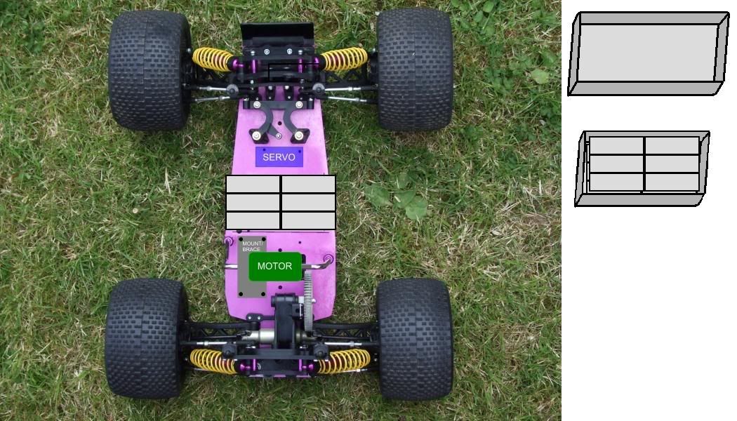 Thanks MetalMan, that'd be really helpful! I've whipped up some rough diagrams of the sort of space there is available on the chassis, though as you can see, there isn't much with either steering servo configuration, and I really don't want to go with 1P. I'm thinking 12 (or 14) cells are going to be pretty hard to cram on there, even when stacked; I can't come up with a decent config. Maybe you guys can! The other thing that concerns me is that, aren't A123 cells kinda difficult to solder? I've not used them before so I don't really know, but I've heard the aluminium can is tricky to solder to?:neutral: