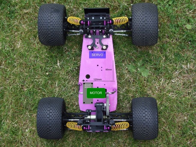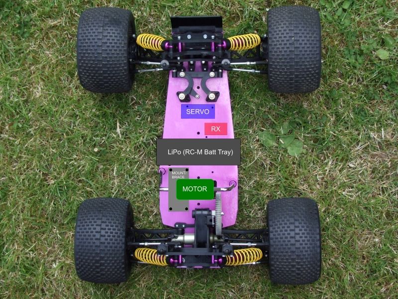 if you dont go A123 cell setup i would think the truck would handle a little better if the wieght was centered in the 2wd here is your picture just modded to show the esc and move the battery more to the center...just a thought. and it would keep your reciver as far away as possible from the motor and battery wires.