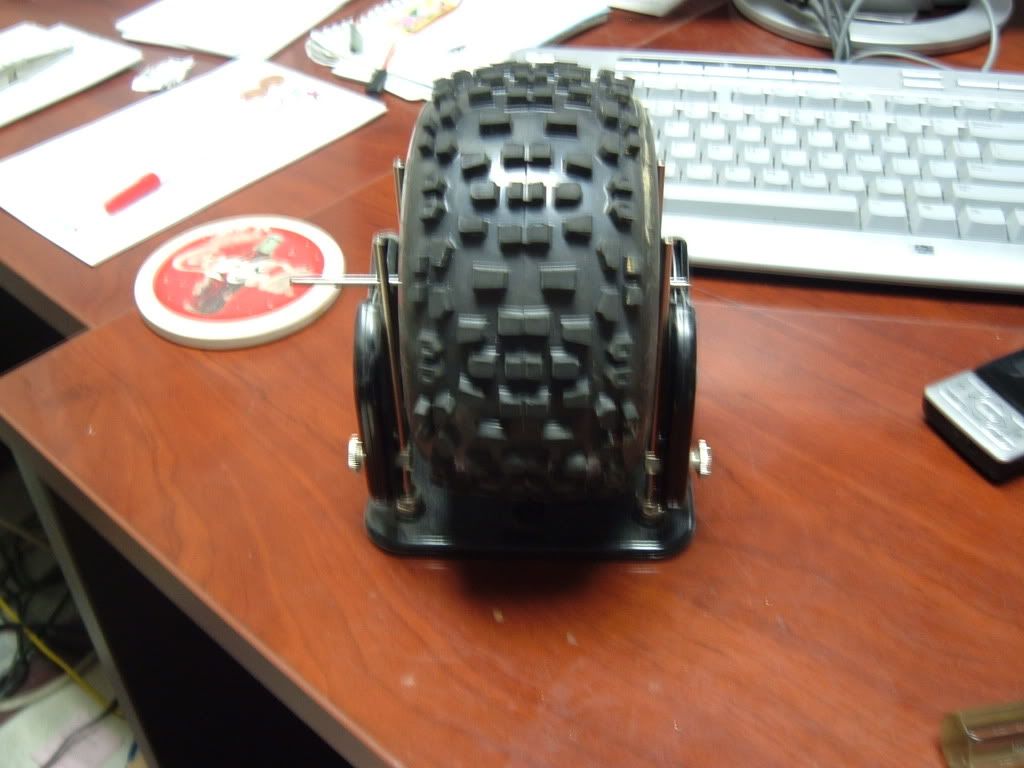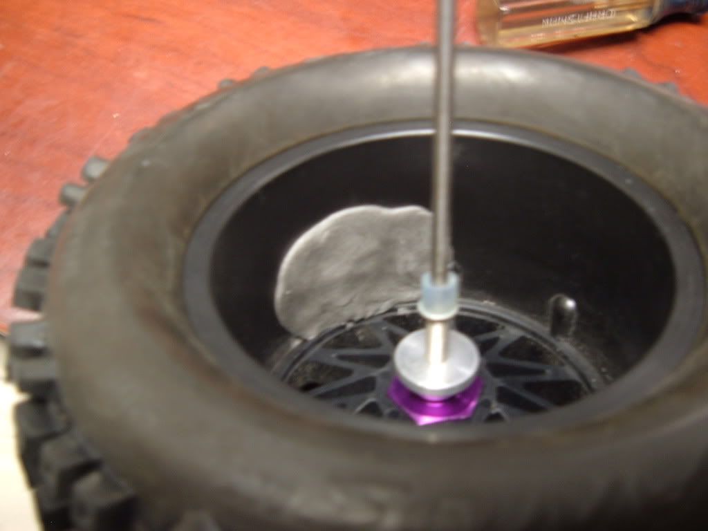 Flipped the tires inside out and applied one wrap of the tape. I did about 1/2" overlap on the ends. Re-assembled the wheels and tires and put them on my prop balancer. Had to use a hpi 17mm hex adapter so that the al cones on the balancer's shaft would center the wheel properly. The hole in the center of the wheel is too big. The epoxy putty worked well, as I could push it into place, and then spread it out a bit to cover the inside of the wheel. I was supprised to see how much I used for each wheel, almost used 1oz of the 2oz packet on the 4 wheels. For testing purposes, I added the tape and balanced 2 wheels/tires and put them on one side of the truck, left the other 2 without tape and unbalanced. Then I went out for some test runs. All I can say is that it makes a huge difference. Tires were pizza cutters on the stock side (easily 3/4" to 1" of balloning top and bottom) and about 1/4" of ballooning on the taped/balanced side. Went back and taped/balanced the other 2 wheel/tires and went out for another test. 44mph radar runs were sooooo smooth and controllable. Massive difference over the non-taped and balanced tires. Well worth the effort. I will do this to all of my tires from now on! http://i206.photobucket.com/albums/b...p/DSCF2432.jpg http://i206.photobucket.com/albums/b...p/DSCF2433.jpg http://i206.photobucket.com/albums/b...p/DSCF2431.jpg http://i206.photobucket.com/albums/b...p/DSCF2434.jpg http://i206.photobucket.com/albums/b...p/DSCF2436.jpg |