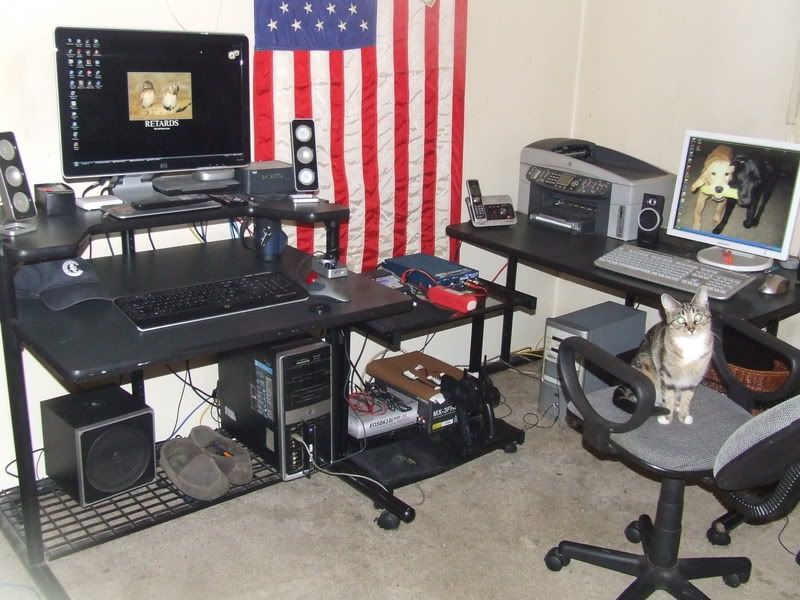 just built a new comp: Shuttle SG31G2 barebones Intel Core 2 Quad Q6600 Kentsfield 2.4GHz G.SKILL 4GB (2 x 2GB) 240-Pin DDR2 SDRAM DDR2 1066 Western Digital Raptor WD740ADFD 74GB 10000 RPM SATA 1.5Gb/s LITE-ON 20X DVD±R DVD Burner Black SATA Model iHAS120-04 PNY Nvidia 7600GS PCI-E (older card) 500GB Music drive via SATA 500GB HD video drive via USB WD external "book" 500GB TV drive WD external "book" 1TB Movie drive then my other computer's pretty old, but a mini server. ASRock mobo (don't remember model) 2.4ghz AthlonXP 1gb pc2100 ATI 9800 about 8 hard drives totaling ~1.5tb. this computer's actually down right now, (won't power on, possibly psu), when it's fixed, I'll move the externals from the shuttle to this computer, and it'll be ~3.5tb. kvm switched, and eventually i'll run vnc to control the mini server. dual monitors as well, w/ a hd lcd tv next to them :) |