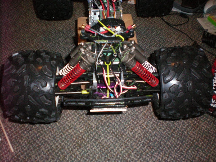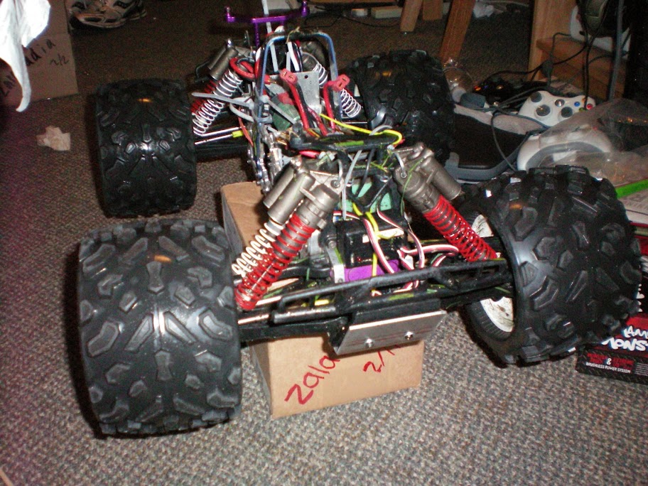 http://lh4.ggpht.com/_VtI5ncEaJBM/SZ...2/100_0143.JPG http://lh4.ggpht.com/_VtI5ncEaJBM/SZ...2/100_0144.JPG http://lh5.ggpht.com/_VtI5ncEaJBM/SZ...2/100_0145.JPG http://lh4.ggpht.com/_VtI5ncEaJBM/SZ...2/100_0146.JPG http://lh4.ggpht.com/_VtI5ncEaJBM/SZ...0/100_0151.JPG http://lh6.ggpht.com/_VtI5ncEaJBM/SZ...2/100_0152.JPG http://lh6.ggpht.com/_VtI5ncEaJBM/SZ...2/100_0155.JPG The pics aren't very good, but I'm not a photographer, and my room is a mess, lol. I'll try to get better pics later. Only thing left is the roll cage. Haven't ordered it yet, but it's gonna be that nylon cage (imun80 or whatver its called). Need some funds before getting the rollcage. I ran it a little earlier with 6s lipo, 50% punch control medium power delivery (a setting for mamba monster), and a loose slipper (it slipped a LOT). I want my weak diffs to last a while, at least until I can afford the roll cage and CEN diffs. It was still popping some wheelies though. I think I can afford to tighten the slipper still, cuz the front didn't lift more than a few inches off the ground. Is it bad for the slipper to slip too much? Had to make a custom skid plate to accomodate the kershaw gearbox which stocks out a tad from the bottom. Made the skid plate start at the rear bumper (giving a solid mount for a wheelie bar if I choose to get one) and basically extends the existing plastic skid in the rear up to the front, then bends down right in front of the gearbox, and attaches to the stock front skid mount. Note that the stock plastic skid in the rear is still there, but under the new skid. For full size images, go here: Brushless Build |