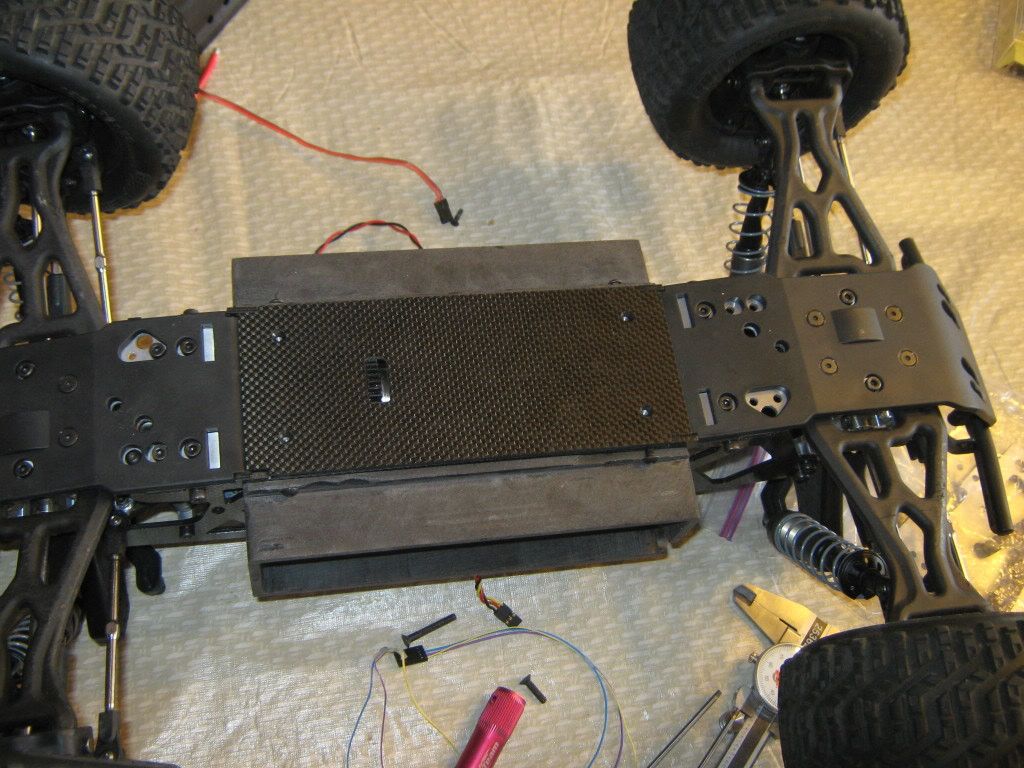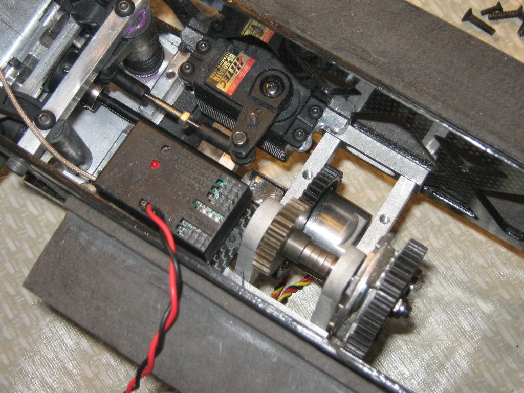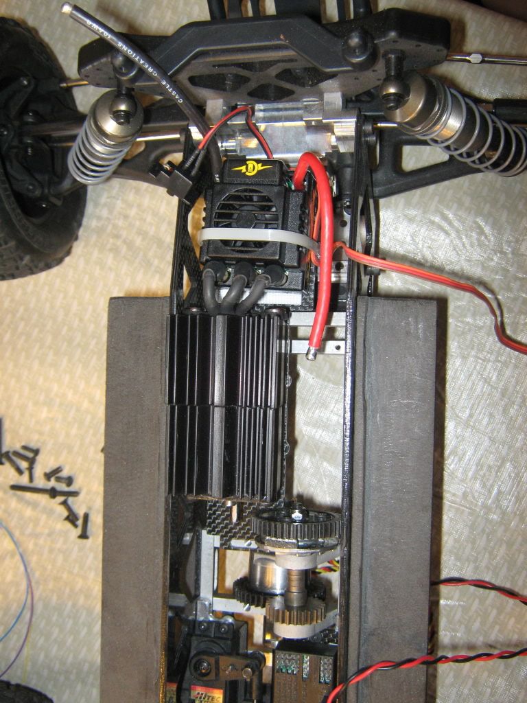 http://i293.photobucket.com/albums/m...e/IMG_0594.jpg Here's an undershot with the skid plate: http://i293.photobucket.com/albums/m...e/IMG_0595.jpg Here are a few showing the transmission separately and then installed. The whole thing will pull out after removing four screws (after removing the motor which consists of two screws) and from there the end pieces pull off so the whole thing will pull apart. Now it's easier to see how the motor plate will adjust from a bird's eye view. http://i293.photobucket.com/albums/m...e/IMG_0587.jpg http://i293.photobucket.com/albums/m...e/IMG_0586.jpg http://i293.photobucket.com/albums/m...e/IMG_0589.jpg http://i293.photobucket.com/albums/m...e/IMG_0590.jpg All I need now is a rear dog bone, the roll bar pieces to get cut at my water-jet shop, and a body. |