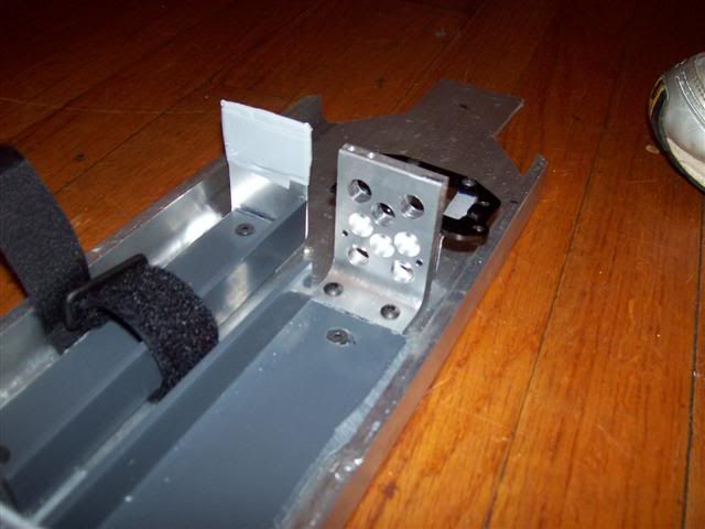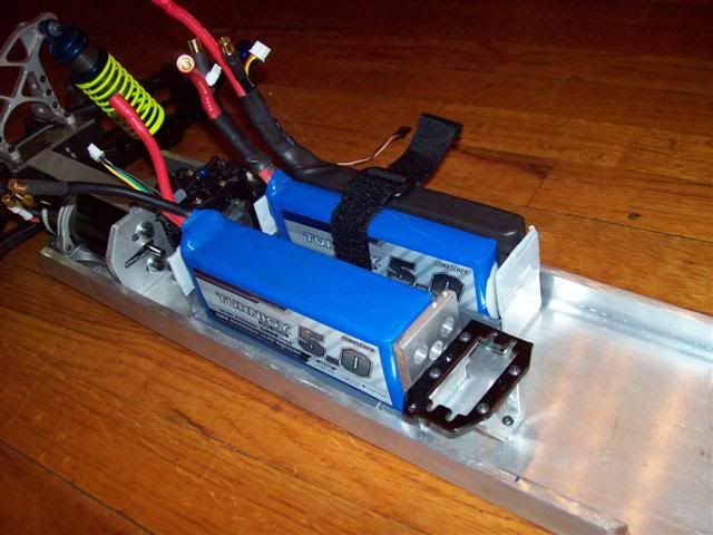 Update: battery trays with Aluminum stops (front and back) installed. I used a 1/4" thick piece of Al at the front of the right hand tray to mount a brace to the front bulkhead and also to attach the steering servo tray.