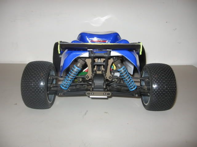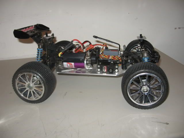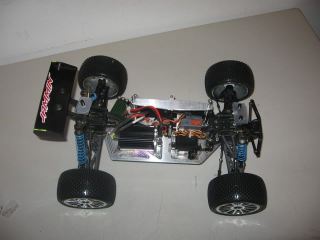 got some tires finally, 30 series,and made a battery hold down for my 5k packs, doesnt do this chassis justice, i also moved the body to allow use of the wing, will get a diff. body as soon as i beat this one up a little, i think i will get some road tires as well
