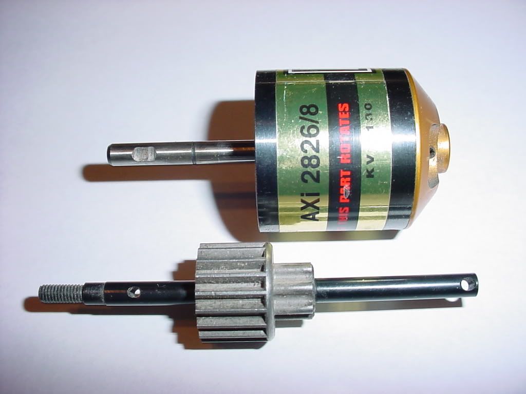The bearings of the motor AND the bearing used in the transmissions have the same ID. Very nice fit. I just tried the input shaft into a 2826 that I have here. The 2826/8 won't work with this type of gearing, but a lower kv motor would. I'll have to plug some ratios/kv's in and see what pops out. |