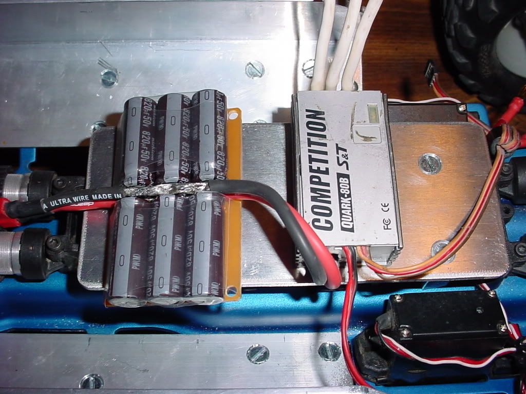 If I may state MHO, I would think of moving the esc around right in front of the cap bank to take advantage of such a massive cap. BTW, those caps look awfully small for being 820uF/50v, they seem like they should be bigger than that? |