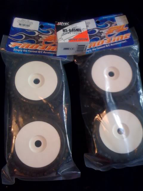 Got a couple goodies for the buggy. A set of buggy badlands premounted on some white rims, along with a HS-645MG.