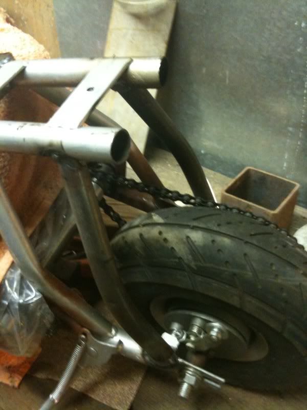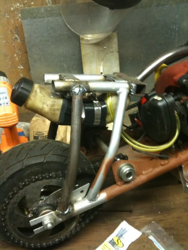Had to cover the motor in plastic and a wet towel to shield it from welding sparks/heat. http://i160.photobucket.com/albums/t...1249324574.jpg Welded on 1" squarestock for brace for centre frame brace. Bent/welded centre brace. http://i160.photobucket.com/albums/t...1249324586.jpg Bent/welded rear frame braces: http://i160.photobucket.com/albums/t...1249324585.jpg Made a bracket to conform to the fuel tank- welded it, and hoseclamped the gas tank to it, with rubber guards. http://i160.photobucket.com/albums/t...1249324570.jpg |
