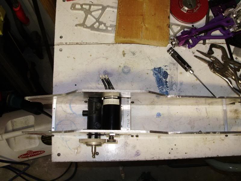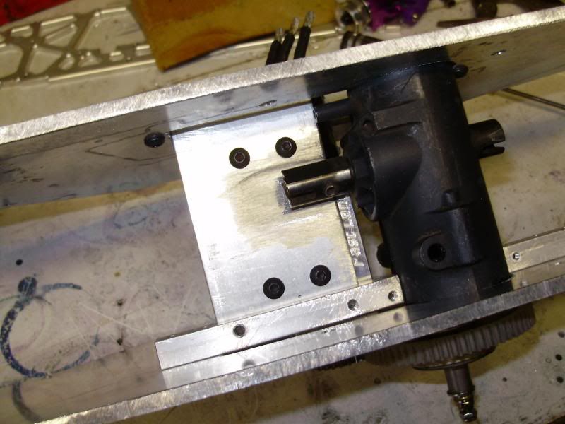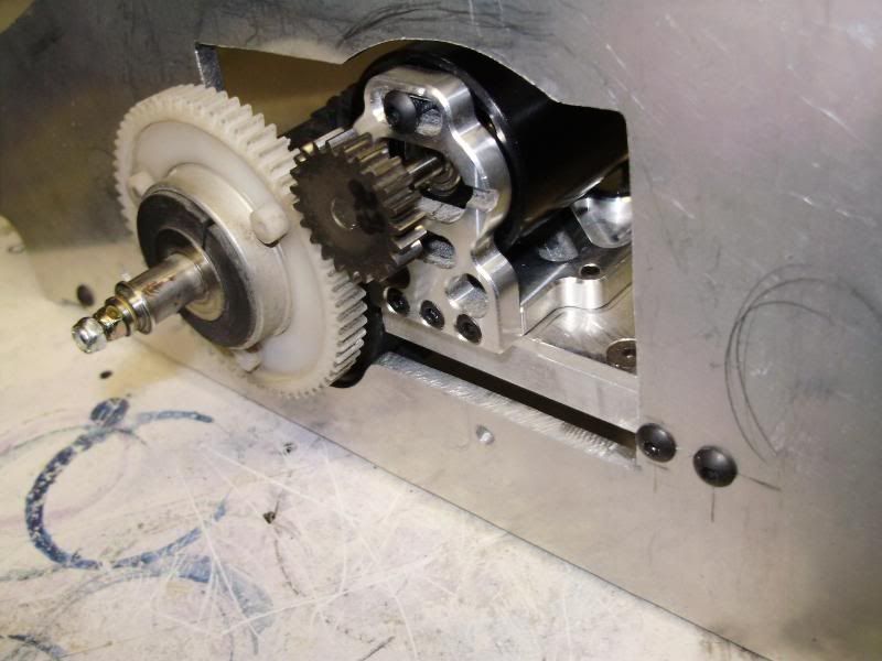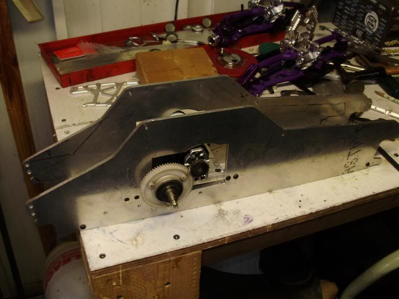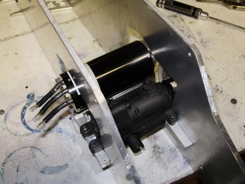 The motor I've decided on is a 1521 1050kv and should work nicely with 8&10S, a little worried the motor might be a little underpowered. I was hopeing to use my 1527 but 1500kv is way to much for 10s. I've installed the transmission, looks a little awkward but the LST tranny is far superior over the Flux trans. It has more gear reduction and a much better slipper clutch assembly. With the trans centered the outdrives are still off set a bit so instead of making Dogbones I will home fab CVD's instead. All the brackets and stuff I made nothing is nut&bolted together, I tapped all connections in 4mm except a few things which are 3mm. Yes I have a brace for the tail end of the motor to help support, not shown in pic. Q; which end should the CVD be on, The Trans or Diff ?????? I still have a loooong ways to go yet, I have to install the battery tray and I have LOTS of finish work to do to the chassis (cut outs to lighten it, file and smooth all edges, make openings much neater and tidy up everything. Was going to shoot for a 60F/40R weight distribution but not real sure where thats gonna lead with how I have stuff now ??? Dual 4s and/or 5s packs will weigh in a lot and hopefully get the balance to where it needs to be .... Still trying to decide on a "finish" for the chassis or go raw aluminum ??? http://i88.photobucket.com/albums/k1...E/P8270043.jpg http://i88.photobucket.com/albums/k1...E/P8270045.jpg http://i88.photobucket.com/albums/k1...E/P8270042.jpg http://i88.photobucket.com/albums/k1...E/P8270048.jpg http://i88.photobucket.com/albums/k1...E/P8270047.jpg http://i88.photobucket.com/albums/k1...E/P8270040.jpg http://i88.photobucket.com/albums/k1...E/P8270044.jpg http://i88.photobucket.com/albums/k1...E/P8270046.jpg |