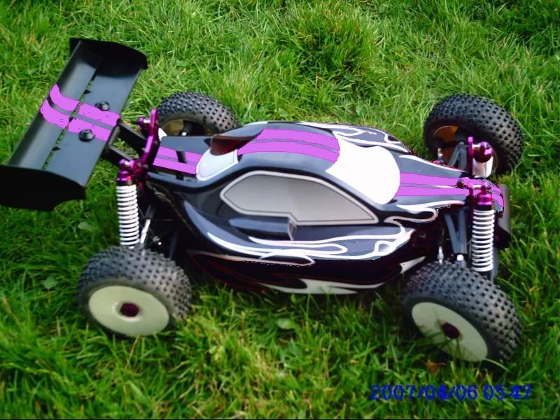 or florescent pink. I like the black and purple as well, and the red on the body clashes. I'm half tempted to strip the body and paint it black with a pair of purple stripes down the middle like the stripes down a ford GT40. I have a set of black road wheels for it allready and with a set of black springs I think it would look awesome (if theres a good body paint match for purple anodizing, anyone know?). But a set of springs and 2 cans of paint goes against my budget and it will be hidden most of the time anyway, I was planing on my oft used black and gold scheme for the scale body, but maybe purple/black and I have enough left over to do the inner body too. |