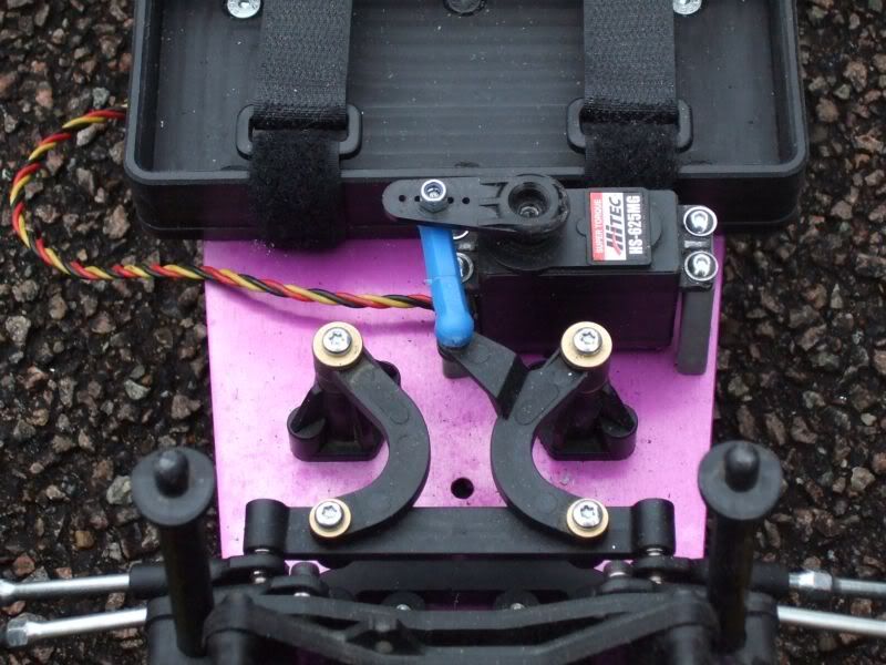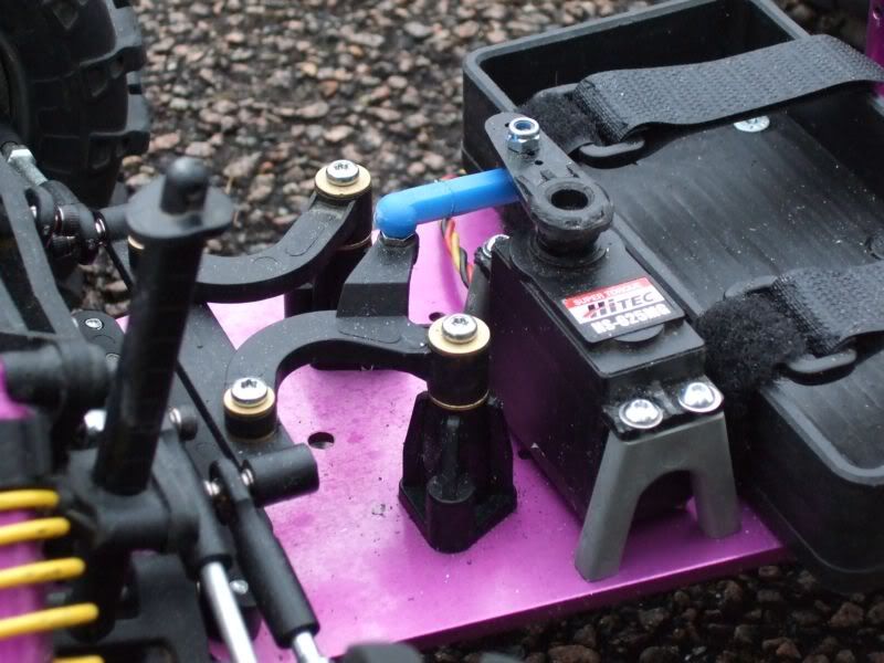 Only a small development, but I finally got around to sorting out the steering servo setup. The stock location for the servo is halfway up the chassis, which isn't any good for this conversion, so I've had to reposition it right up at the front with some T-Maxx throttle servo mounts which I've shortened: http://img.photobucket.com/albums/v6...r/DSCF0225.jpg http://img.photobucket.com/albums/v6...r/DSCF0226.jpg ...and some RC-Monster love lol. Had to use that sticker for something!:yes: http://img.photobucket.com/albums/v6...r/DSCF0229.jpg For the time being it's set up without a servo saver, as I just don't have one that will fit. The short blue link in the photos though is a pair of RPM ball ends (one shortened) with threaded rod, and this has some flex in. Hopefully if (sorry; WHEN) I crash, that'll give way instead of making the servo's innards into iron filings.:lol: Not that it matters, as itll only be running a cheapo TowerPro until I can afford a decent servo. http://img.photobucket.com/albums/v6...r/DSCF0228.jpg Thanks for looking.:yes: |