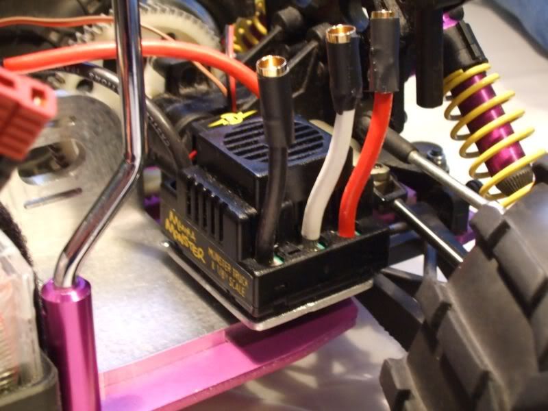 Florianz, I can see where you're coming from, but there's no provision for putting a slipepr on the Havoc unfortunately; just wasn't designed with it in mind. It shouldn't be a problem though. The spur is Mod 1 glass-fibre reinforced composite, so should stand up fairly well. And if it does strip, it's easy to replace.:yes: SuperBasher, that shouldn't be a problem. The lexan case isn't airtight by any means anyway, but the pack shouldn't get anything above a little warm, being rated for 175A constant. I'll keep a close eye on it in the first couple of runs, but should be alright. Thanks again for the compliments guys, really appreciate it! I just got the MMM all soldered up with its motor plugs and deans, as well as the battery. Plugged 'em both in, and all's good so far. It's one of the few V1s still hanging around, but it has the new case and firmware...so I'm *hoping* it'll last well. Should do. Next and final stop is the motor...:party: |