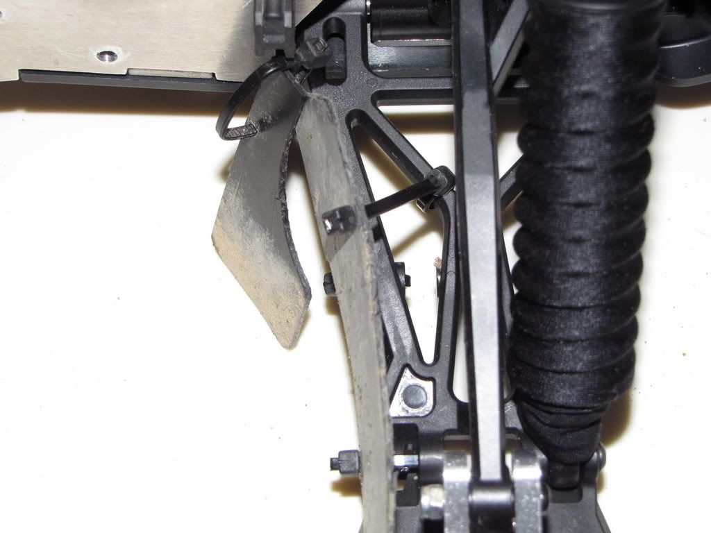 Originally i used plastic cover from an A4 sheet paper holder. It was too thin. I run in a few places that are a little rocky and the guards were shot to pieces by the flying stone after just one run. Then i had the idea to cut the guards out of this document case that i no longer needed (don't think it was that expensive anyway). The material was much thicker and withstands the stone strikes well. http://i1010.photobucket.com/albums/...t/IMG_0394.jpg Close up of the mounting method. Basically just zip tied through the two holes in the arm. The third zip tie to the top is needed to stop it bending forward after a while. This method works well except that after 10 runs or so stone strike will usually wear through the bottom zip ties but they are easy to replace. Combined with a guard that I used to mount on the rear stock Flux battery mount the rear dog bones and drive\axle cups would remain very clean compared to no guards. Also used to get stones jammed in that area fair bit before i put the guards on, well worth the effort.http://i1010.photobucket.com/albums/...t/IMG_0390.jpg |