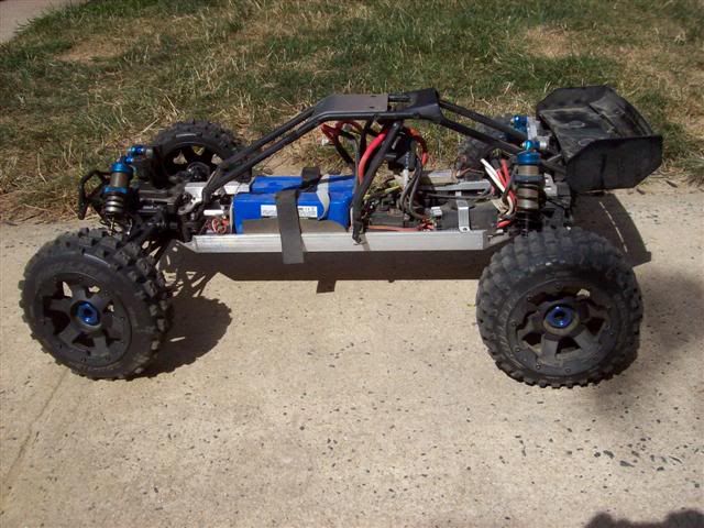 batteries 98F esc 112F motor 132F I will gear for higher speed on 8s and give it a try. Here it is, finished: http://i779.photobucket.com/albums/y..._4505Small.jpg edit: I looked at my new rollcage mounting brackets in the center after driving it and rolling it only once - and they're bent. So instead of 1/8" Al angle brackets, I guess I'll go to 3/16". Well, now that I'm finished building the truck, I guess I'll start fixing it. :yes: |