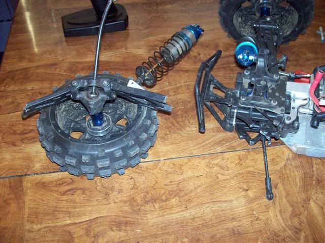 I was expecting major damage as I saw one wheel + other parts flying in one direction and the rest of it in another. So I was happy to see it was mainly the plastic arms that broke and a bent driveshaft: http://i779.photobucket.com/albums/y..._4511Small.jpg Then I got home and saw the right rear driveshaft :surprised: http://i779.photobucket.com/albums/y..._4512Small.jpg Those arms are bent and need replaced too. Luckily I have a box of extra arms and other parts - I'll have this back together to take it out tomorrow. :yes: |