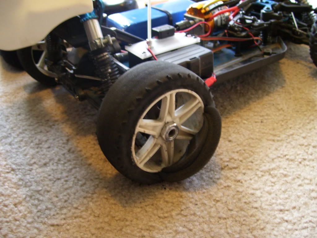 When i finally actually peaked the pack, the mm's overvoltage thing kicked in, so i had to turn the car on and off a few times... Here is the first look at the Brushless raze! http://i152.photobucket.com/albums/s...0/100_0952.jpg http://i152.photobucket.com/albums/s...0/100_0953.jpg Here is the blown tire from today http://i152.photobucket.com/albums/s...0/100_0955.jpg i lost both of my lower kingpin screws.... then in the process of trying to fix them, stripped the threads in the Hub itself... so new ones will be on the way shortly http://i152.photobucket.com/albums/s...0/100_0951.jpg I have a nice set of road tires now! i think im gonna hit them with some wd40 to soften the rubber for more bite... i havent seen a wheelie yet... http://i152.photobucket.com/albums/s...0/100_0957.jpg |