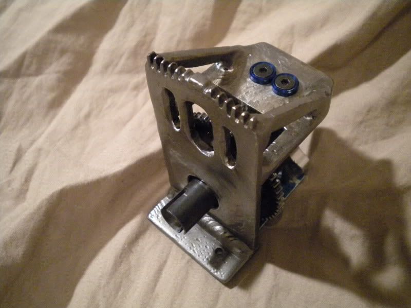 What I have done is eliminate 1 extra part from the entire assembly, turning the motor mount, top plate, and 1 of the center diff mounts into a single piece, for a 2 piece design. I originally planned on welding on a piece of 1/4'' plate to the bottom, using the same bearing retaining plate design I used with the current setup, and drilling and threading the 1/4'' plate, as well as using tabs that attach to the upper section of the chassis, but that just seemed over-complicated and not really necessary, so instead I welded on a piece of 10ga (to keep the weight down a bit over more 3/16'' without compromising any strength), and drilled 2 holes through it, not threaded as there will be a nut on the end of the screws going through, and decided not to use tabs that mount to the upper section of the chassis since there isn't really a need for them and it would look cleaner without them. I was also lucky enough to have drilled the perfect sized hole in the motor mount plate the first time around, as the bearing fits in with no slop. I then welded on a piece of 14ga with a smaller hole to retain the diff bearing. I also filled in the 4 holes in the motor plate from the previous design and ground them smooth, and did the same with the top plate holes, then drilled 2 new ones slightly farther back to prevent the center diff from being able to walk back and fourth in the bearing holes. The result was pretty good IMO. So post up, let me know what you think! Anyway, here they are - http://i291.photobucket.com/albums/l...n/DSCN1268.jpg http://i291.photobucket.com/albums/l...n/DSCN1263.jpg http://i291.photobucket.com/albums/l...n/DSCN1265.jpg http://i291.photobucket.com/albums/l...n/DSCN1264.jpg http://i291.photobucket.com/albums/l...n/DSCN1267.jpg http://i291.photobucket.com/albums/l...n/DSCN1266.jpg And I did spray it with clear coat, so it should stay nice looking for a long time. So post up, let me know what you think! |