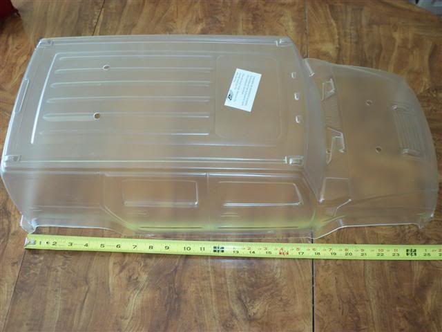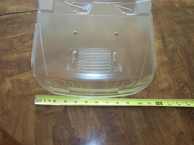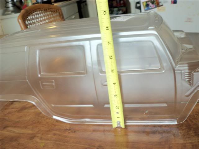 The dimensions of the body are: 11.25" wide at wheel wells (widest spot): http://i779.photobucket.com/albums/y..._1126Small.jpg 25.5" long: http://i779.photobucket.com/albums/y..._1128Small.jpg 7.5" high: http://i779.photobucket.com/albums/y..._1131Small.jpg and compared to 4 year old girl: http://i779.photobucket.com/albums/y..._1132Small.jpg |