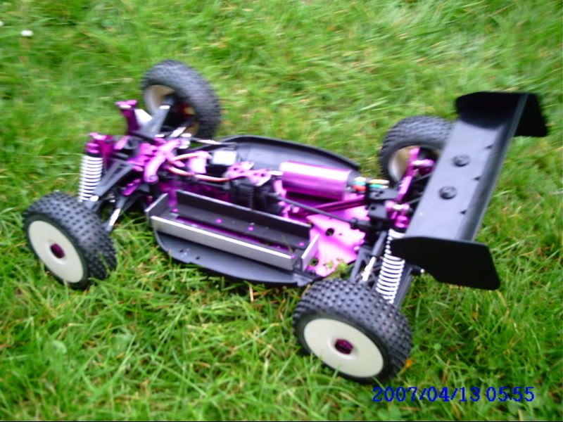 or florescent pink. I like the black and purple as well, and the red on the body clashes. I'm half tempted to strip the body and paint it black with a pair of purple stripes down the middle like the stripes down a ford GT40. I have a set of black road wheels for it allready and with a set of black springs I think it would look awesome (if theres a good body paint match for purple anodizing, anyone know?). But a set of springs and 2 cans of paint goes against my budget and it will be hidden most of the time anyway, I was planing on my oft used black and gold scheme for the scale body, but maybe purple/black and I have enough left over to do the inner body too. |