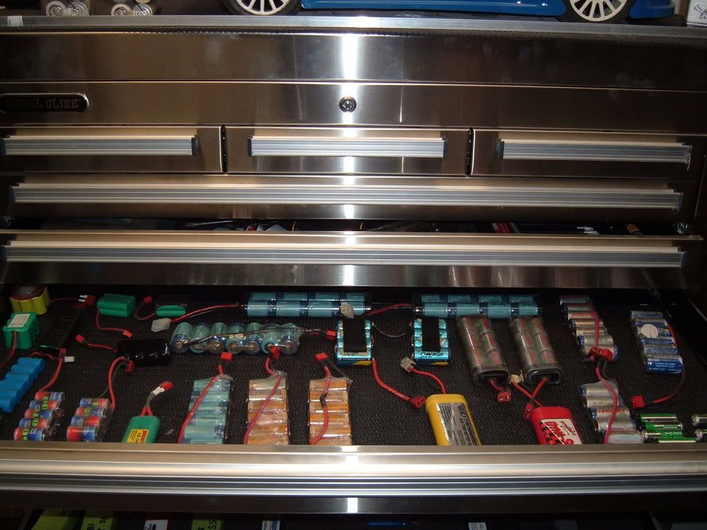 I also added 4mm bullet connectors to the cargers, so that I can remove them seperately and use them in the field if I need to. I also made my lba and eqinox balancer high current capable and bought some universal tap adapter boards from cheapbatterypacks.com. No need to search for adapters anymore, yay! Only had one isse, while I was air nailing the plywood together a nail must have hit a knot and shot out the side of the board and bounced off my left thumb! Felt like my thumb had been hit by a hammer while resting on an anvil. I must have druised the bone! Oh well, it was worth it! http://i206.photobucket.com/albums/b...p/DSCF1873.jpg http://i206.photobucket.com/albums/b...p/DSCF1874.jpg http://i206.photobucket.com/albums/b...p/DSCF1875.jpg Heres a pic of my lipo drawer, some are missing right now, but that is most of them! http://i206.photobucket.com/albums/b...p/DSCF1876.jpg And a shot of the nimh drawer, I do not open this one very often! http://i206.photobucket.com/albums/b...p/DSCF1877.jpg |