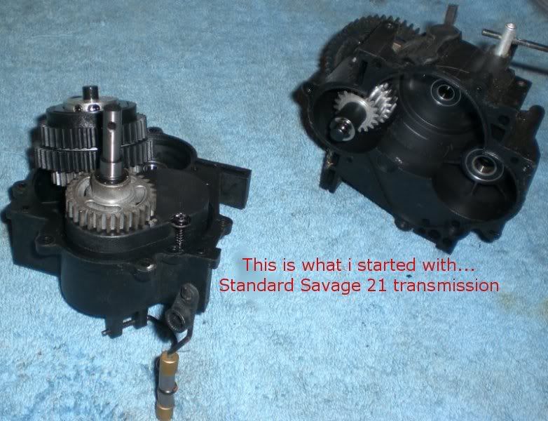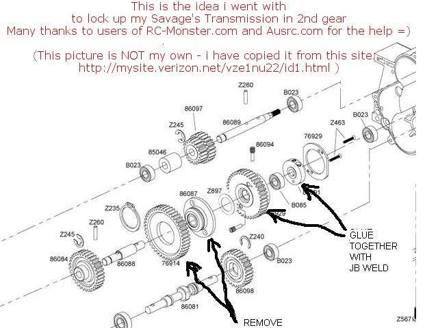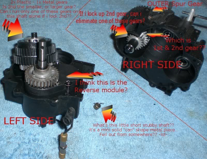 Yo everybody =) For my BL conversion, I wanna lock this tranny up in 2nd gear (so i can use the BL motor for brakes and reverse) and take out everything i dont need... OK - so i've opened up the tranny, and i think it's got a reverse module... i need to know what gear is what in here, and what i can take out and what has to stay... I'll get some pics tomorrow, cause i dont really have time to write this even, but would like to get some sort of a start on things -lol- I'm wondering - on the OUTER SPUR gear side of the tranny - which of the 2 gear INSIDE relates to 2nd gear, and which is first? Would the gear on the OUTER edge of the 'box (closest to the spur gear) be second, or is that first? On the other side... there's 3 gears... 2x plastic and one metal... the metal gear is locked on the shaft with a pin, and spins/connects to another gear which i think is basically the reverse module?? (same side of the 'box - the other side to which the spur on the outside that connects to clutchbell gear is on) damn - i'm stopping here - i cant explain this without confusing anyone -lol- But basically need help from here to lock it up in second permanently - forward and reverse =) Will get pics tomorrow, and make this thread a lil more useful -lol- cheers guys =) -daniel GOT A PIC NOW! =) http://i211.photobucket.com/albums/b...smission02.jpg Thoughts please on what i can take out and how to lock it up?? =) |