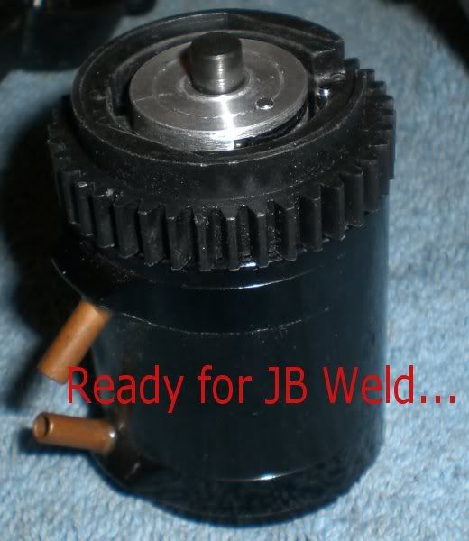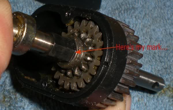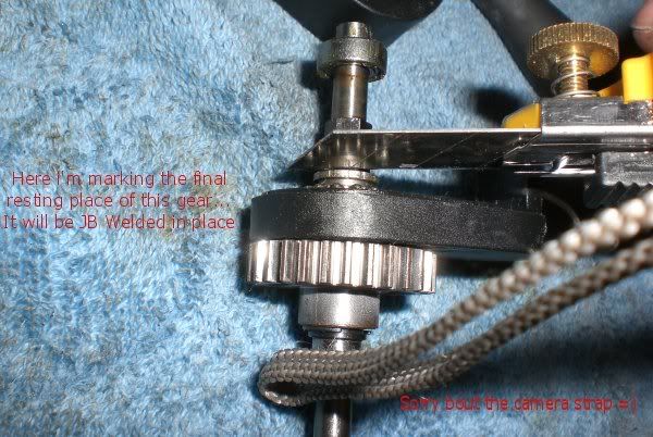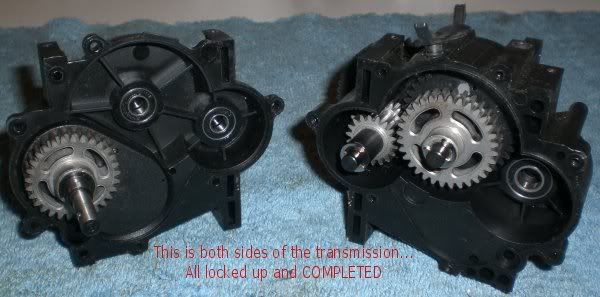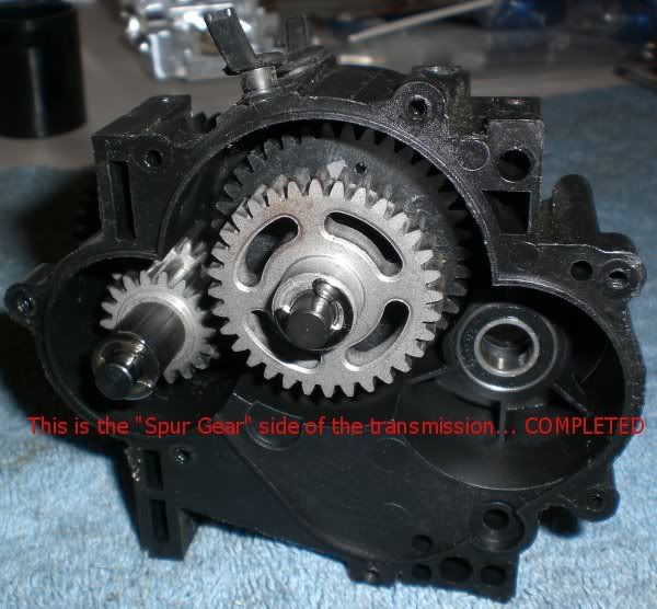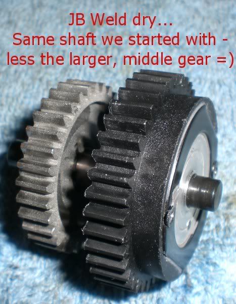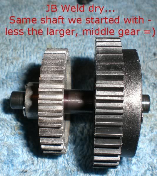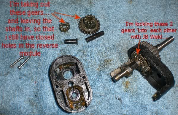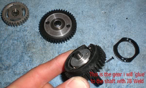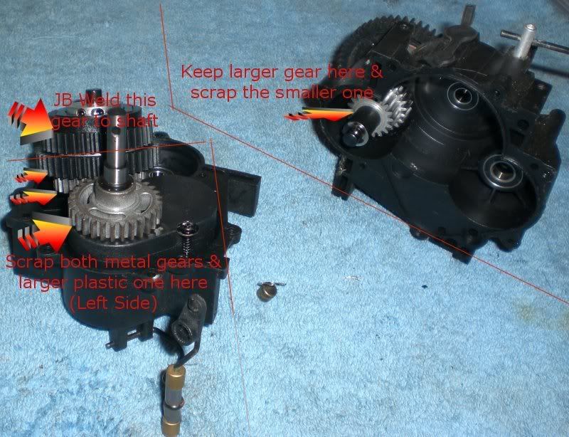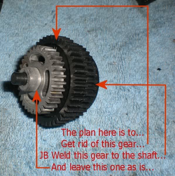 nope you got it wrong in there. Keep the smaller gear on the right side. Keep both metal gears and the larger plastic gear on the left side. The 2ng gear clutch is bolted the the shaft so you just need to JB weld the large plastic gear to the clutch