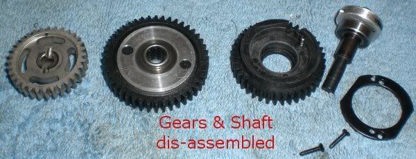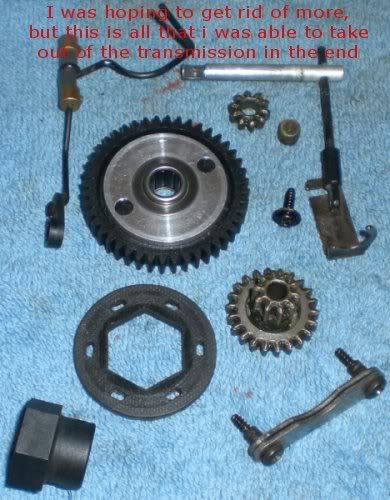 bigger gear is second gear. Use jb weld to weld the gear to the clutch. Remove all other gears and good to go. THe small solid peice is the part for the brakes (mechanical brakes) it is how the shaft that rotates actually pushes out on the pads to slow it down.
