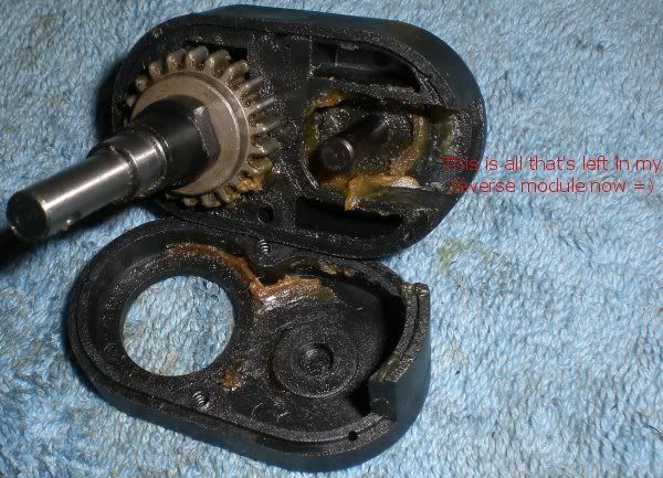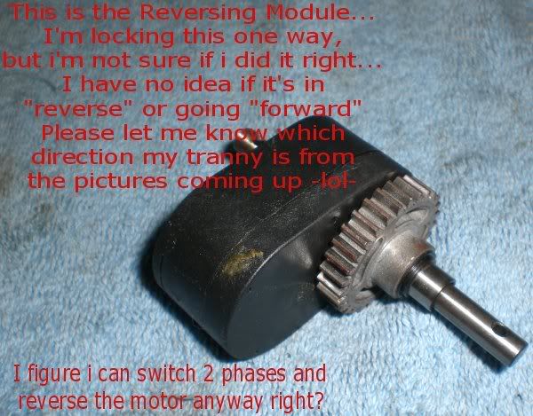 anyways... here is what i did...OH!! can someone please let me know how i locked the reverse module?!?! i'm stumped as to weather i locked it in forwards or reverse?? -lol- I figure i can swap 2 wires on the motor/esc and be fine anyway, but it would just be nice to know -lol- thanks for your help guys!! i really appreciate it - oh - and i went with the pic from your post Darion, cheers mate =) http://i211.photobucket.com/albums/b...smission01.jpg http://i211.photobucket.com/albums/b...smission04.jpg http://i211.photobucket.com/albums/b...smission05.jpg http://i211.photobucket.com/albums/b...smission06.jpg http://i211.photobucket.com/albums/b...smission07.jpg |