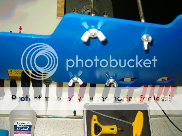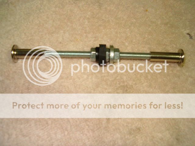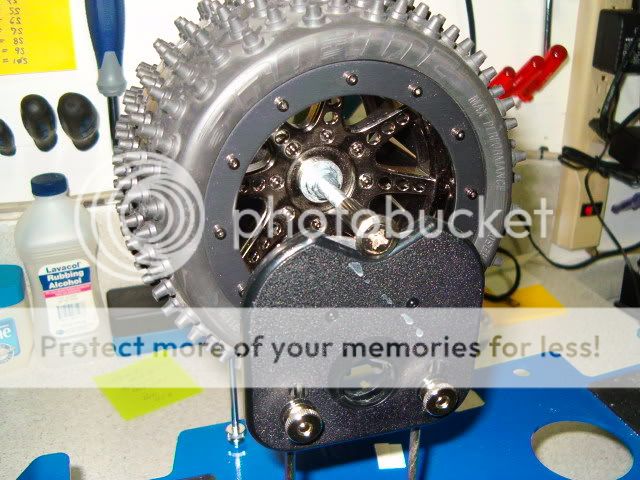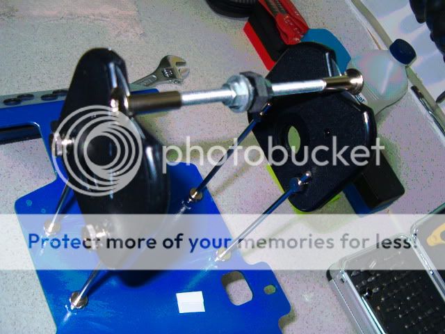 Anyway from that thread it lead into taping tires, and balancing wheels for better vehicle performance. So I wanted to take it all the way and do whatever I could to make things work better. So I glued the insert to the rim with a bead of CA glue in either side of the rim in order to keep the insert from shifting during operation, which would throw the wheel balance out of wack. Then I turned the tire inside out and wrapped reinforced packing tape on the center of the wheel two times to help prevent balooning as much as possible. After remounting the tire and clamping them in place on the Axial wheel it was time to do some balancing. Once I figured it out this is really easy to do. So I had purchased one of those Dubro wheel balancers from T/H, but it is just too small for MT tires. So I mounted the unit halves to my truck stand and spaced the two halves far enough apart to accomodate MT wheels. I also tried their nifty adapter shaft kit, but that is just way to pewny to be of any use with MT wheels. So I had to make up a custom shaft setup for the Axial wheels 17mm adapter. I found something in my shed hardware stuff for the rod ends that works perfectly. It is actually two binder caps for holding paper in a binder. Then the fun begins. You rotate the wheel slowly and let it settle to a stand still. Usually it will kind of lunge and go back and forth until the heaviest side ends up on the bottom. Then you place some kind of counterweight (on the inside) of the opposite side (top)of the rim. You just repeat this step until the wheel spins freely without lunging or going back and forth. You will see that it actually spins smoothly much longer once you get the balancing correct. Without using a computer it is not a perfect science, but you can get things pretty well setup for inproved performance. It will actually take some strain off of your drivetrain and chassis by doing this. So there you have it. I am attaching some photos from photopbucket of my balancer setup. I PLACED THE PHOTO LINKS IN A POST BELOW |