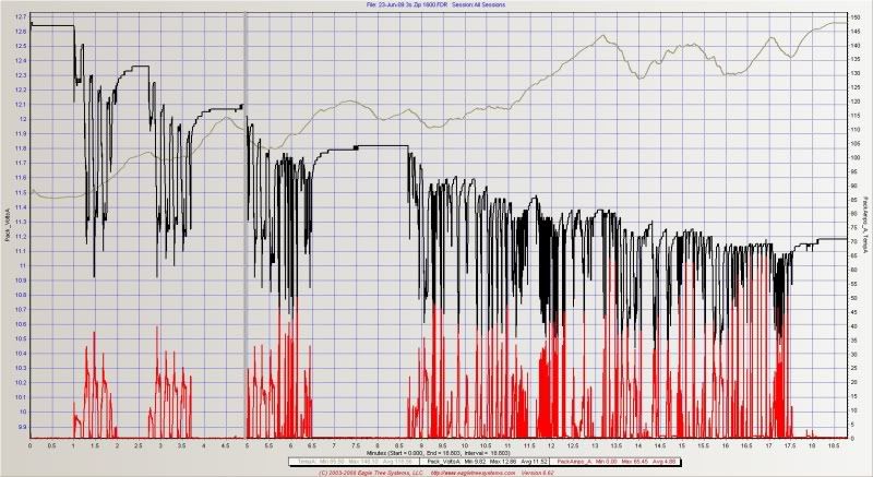 http://i192.photobucket.com/albums/z...600notemps.jpg Clickable thumbnails for larger pics: http://i192.photobucket.com/albums/z...h_a2efef2d.jpg http://i192.photobucket.com/albums/z...h_226f01fd.jpg Motor temp Max - 148 Min - 85.5 Avg - 118.56 Amps Max - 65.45 Min - 0 Avg - 4.88 Volts Max - 12.66 Min - 9.82 Avg - 11.52 I was doing speed runs for most of it. I did some full throttle grass running toward the end, which is what really brought the high amps and the temps up on the motor. The battery still had life in it, but I was ready to come in after about 20 minutes because of the heat. |