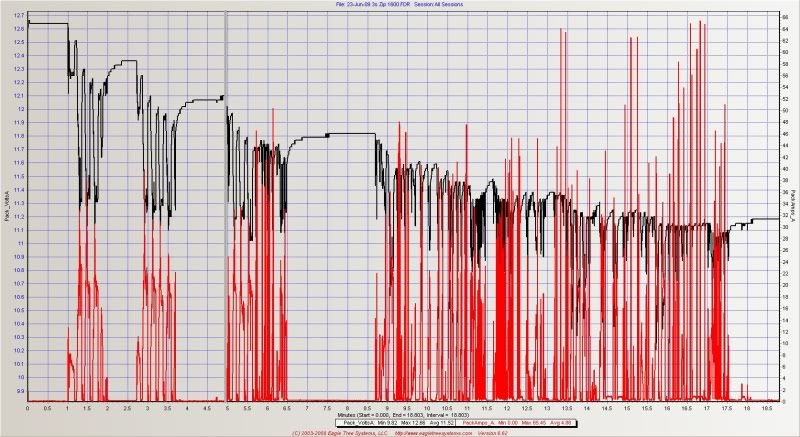 This Zippy pack is rated 20C-30C, 1600 mAh. At data points where the current was 32A (20C) the voltage points averaged out to 3.6V/cell. At data points where the current was 48A (30C) the voltage points averaged out to 3.4V/cell. Most of these data points were collected during the latter half of the run where the battery voltage was already dropping from use. When I get more of these packs in from HobbyCity, I'll be running them in parallel. It looks like I'll have more than enough headroom. |