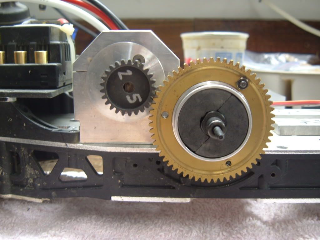 I need to get another TDR mount, so I will have "the dude" drill and countersink the front plate for m4 size screws. Turns out my new 1521 1y also has m4 threads, so maybe I will have him make me 2 of those plates... Anyways, here are some pics. The spur is a 59t, and the 25t pinion will not mesh quite close enough. This is not due to lack of adjustment in the mount, the 1717 contact with the tranny "foot". I can cut the "foot" down about 1/8" and re-drill the hole in it and in the chassis to gain the necessary clearance. However a 63t (stock lst 2nd gear) spur should work fine without any mods to the tranny. Pic time! http://i206.photobucket.com/albums/b...p/DSCF4016.jpg http://i206.photobucket.com/albums/b...p/DSCF4017.jpg http://i206.photobucket.com/albums/b...p/DSCF4018.jpg http://i206.photobucket.com/albums/b...p/DSCF4019.jpg |
