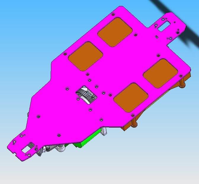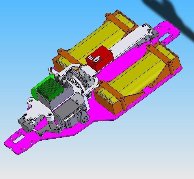 The materials will be 6061-T6 aluminum. The chassis is standard stock .098" thick. I was going to go a little thicker but I didn't want to add too much weight and the upper brace should be sufficient. I have a machine shop in MA that I deal with that owes me a favor so I'm waiting for a quote. The upper brace should be the only pricey part. The rest is standard stock and uses a fairly large radius through out. I may use an irridite finish if any. My goal with this project was simple.... Use the same length and wheel base as the stock MT2 SS. I did not lenghten the chassis at all; just widened it for the batteries. They are as far forward as I can go since they sit under the spur gear cover. (Any closer and the pinion will rub) As a result I swaped the center dogbones front to back. This allowed me to move the gear assy forward enough for the batteries. The dogbones determined the center location. I'm going with the Mamba Max 4600 and 12 GP3300 cells for now. That should rip pretty good. I'm using Solidworks 2006. Any more input is welcome!! |