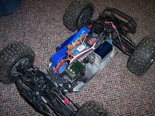 now my LS10 which i have been using this same setup on i got it down and it flexes really bad,it also has a plastic rear diff brace and with the HUGE jumps ive done with it there is no telling how much hell the motor has been through, but i havent had any screws break, or any gear mesh problems either so i dunno, maybe my mounts are just thin enough to flex with the chassis yet still hold everything solid they are only .100 thick (there is a pic below)