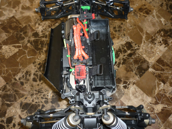 Cleaning this buggy after its first race was brutal. Not having stone guards with the giant body that doesnt fit the car = a mess! My first mod was to fit a guard on the right side. The right takes all the damage <Servo, ESC, transmitter box, and motor> The left side doesnt have anything to get destroyed, the battery box takes the beating. FYI the body is a JC High flow for a RC8 trims out fine.