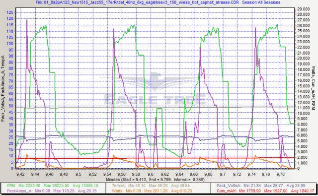 Latest log recorded yesterday with 8s2p A123 while making speed passes. Notice the amp spikes (20-25A) while the green rpm curve is falling. I never recorded amp spikes as high as described in that article.