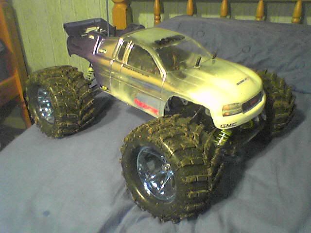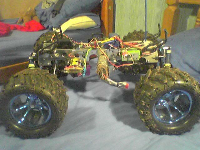 Sorry for the terrible pics. As you can see I have some pretty bad camber in these pics, the truck is in a total mess, and since these were took I have started custom-fitting an aluminium bellcrank steering kit actually meant for the Maxx trucks. Also I plan to install a 6-shock powerstroke shock setup soon amongst other stuff. Thanks for looking.