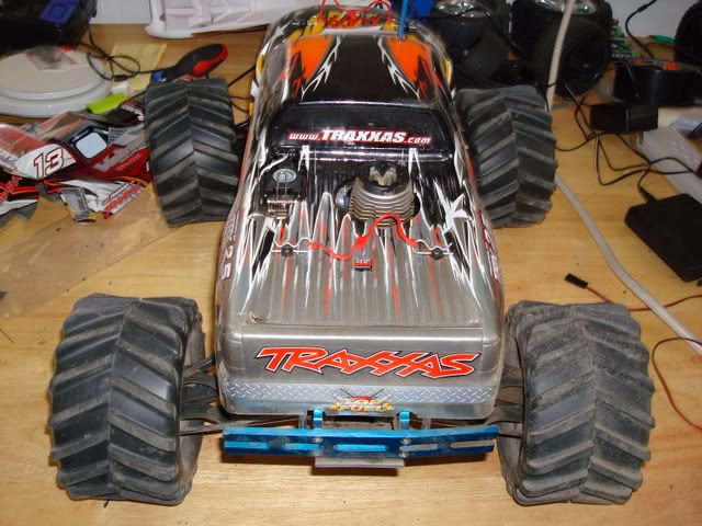 now first i am a big fan of electric. in no danger of losing me to nitro. with all that said i spent almost all week getting my tmaxx 2.5 to start. well today she was able to run perfectly fine. so i managed to sneak in the break in on the 2.5 engine. right after break in the motor caused my second and last (on hand) glow plug to fail. the truck got banged up -pretty good near the end when i too ka few turns too fast and she rolled over on me. the truck is sporting the disruptor body form traxxas and was able to take some paint off and also something at some point puched a decent sized hole in the left rear corner of the body. i wont be buying any glow plugs till this weekend when i go to work. for those who dont know i work at a hobbytown usa that is very local to me. anyways here are pics of the truck within minutes of break in ending: