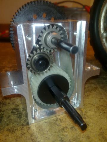 That is definately awesome work on the chassis, and tranny in particular. If I had my way, the tranny wouldnt have an idler gear as you just dont need it with BL powered vehicles- swap 2 wires around and the motor spins the other way, so no need for the idler. If you have your own cnc machine at home/ unlimited access to it, Im sure plenty of folks here will want to make good friends with you, me included...