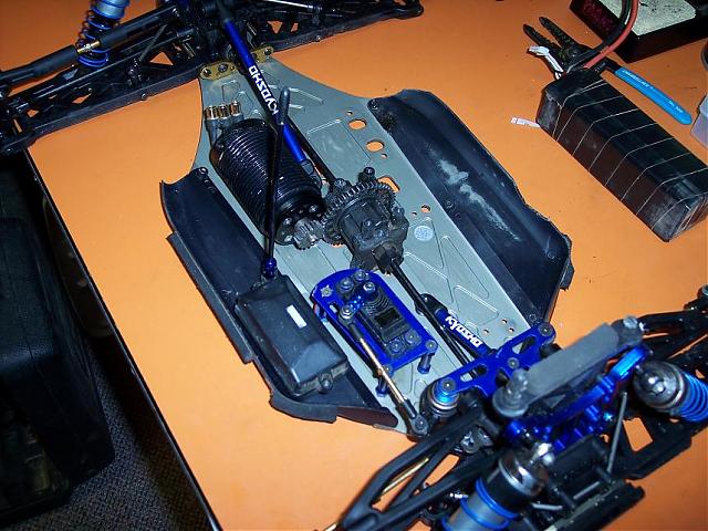 This started as his race truck from this year (he has bought a new st-rr kit to run nitro next year), since its been raced hard the chassis was BADLY worn in the back so i made a skid plate from .080 6061 T4 plate, little late to protect but itll reinforce it a little bit and prevent any further wear. Ill be using my 1515 2.5D F out of my xray with new bearings, along with mikes front and rear covers (i replaced it with a tekno 1512), a Mamba Monster Maxx esc from holmes hobbies, Mike's new BAD ass lipos in the 5000 5s2p version, Ill alos be using RCM pinions, RCM Kyosho motor mount, and RCM custom tray (like brian's for the 5s2p lipo), im using a slash reciever box, and a Kyosho transponder mount.