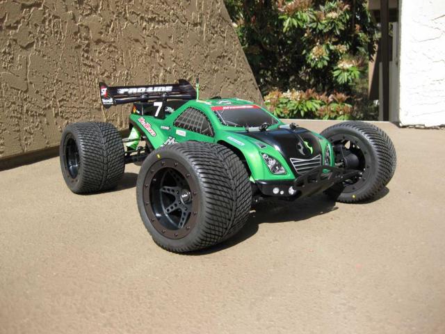 Thanks for the compliments, it took some time to think of a cool paint scheme for this truck and I think the green/black turned out great. Also I noticed when I was testing the truck out that the front tires kept ballooning and popping my left front tire off, so I put a heavier weight diff oil in the center diff, hopefully this solves the ballooning problem.