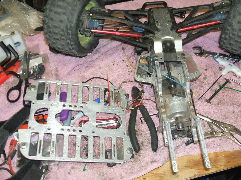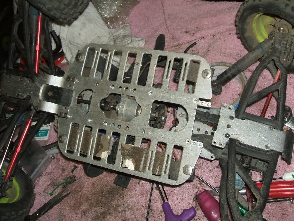 It's not a long and drawn out one like Marks (mkrusedc) "My Neu Maxx is almost done" is. Just kidding you Mark. Although ironically Marks post was the one that got mine to be 2 page long over there and still is only 2 pages. Thanks again Mark. A goal I thought it might never reach. Anyways pics of what the G3R looks like after such neglect. At one time I made some lexan protectors for the g3r skid plates. These eventually broke and never got replaced. I thought back then no big deal. If the two plates get chewed up too bad I will just order up some replacements. Well as the old say goes you only have one set of teeth so take care of them. If I knew I had only one set of skid plates. I may have lived the last 21 month differently. The G3R chassis where the batteries strap onto has a little bit of a bend to it on one side but nothing bad. Got it bent back close to original