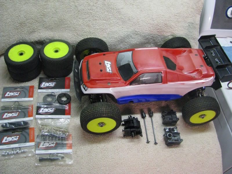 It comes with two full sets of 17mm buggy rims/tires. The one that is on the truck right now looks to be almost brand new, I've never used them. The other full set is very well used and can only be used for practice or onroad bashing since they are very worn. The Ten-T will also come with some NIP parts and some used parts as well. Come with the stock nitro body, in decent shape.