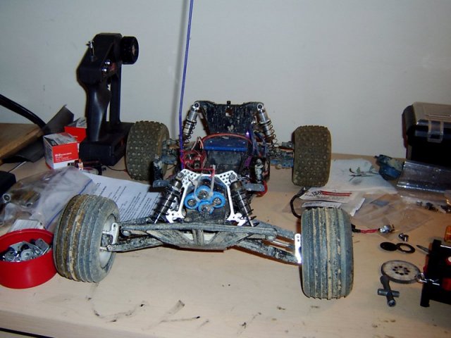 I regularly make jumps that would clear cars no problem. I'm planning to jump my pool on 12 cells once i build a ramp. Our regular bashing spot is a skate park. Alu castors and Front Shock tower help ALOT. i used to bust front shocks every other run, and figured it was due to the stock front shock tower having so much play/flex that when i landed wrong, the shocks compressed at not so good angles bending them or busting the mounts. The RPM rear arms are there because i busted the stockers after jumping off a 30foot drop. Alu castors are a MUST for a basher. I still have 6 pairs of stockers on hand because i used to bust them so much. Havent busted the alu in 5? weeks now. I run 2-3 packs a day atleast, and rarely break anything now. Between the custom steering links/tie rods, those 2 alu parts, and all the RPM stuff, its got a nice weight/strength ratio. That melted spur is the first replacement part i've had to get in 3 weeks.
