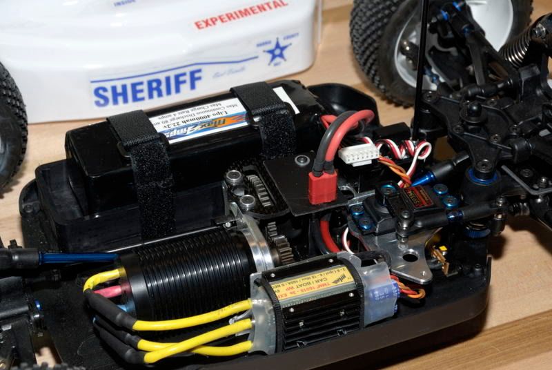 Here are some pics. It's in the experimental stage right now. It's a lot faster then the gas cars. The control is not as good as the gas car yet, but it's a lot of fun.:) It takes a lot of trial and err to set the speed controler for your application.
