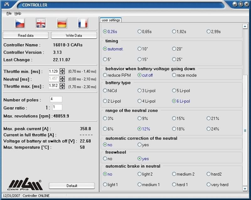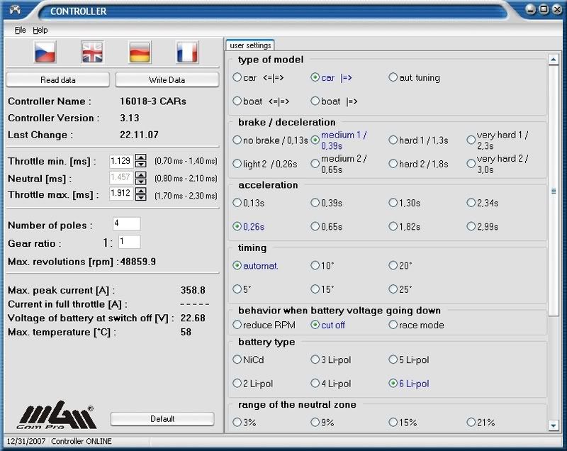 The speed controler is not easy to program. I have attaced my settings. This is going to very depending on your setup.