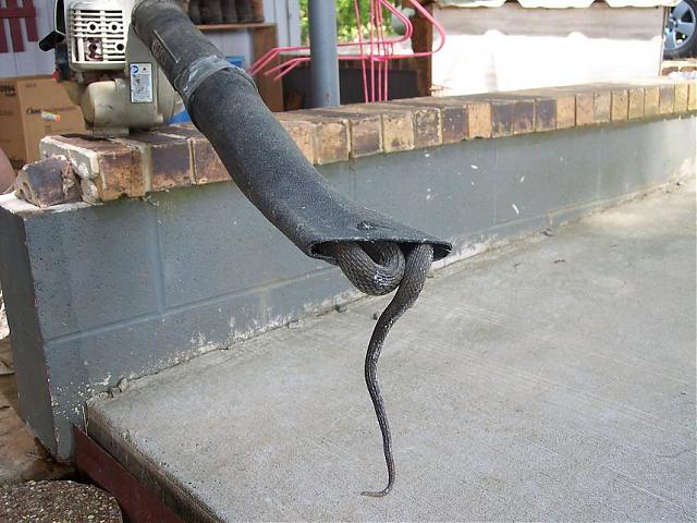 we are pretty sure it ran up in the leaf blower trying to get away from my dog, (he likes to kill snakes and eat them, wierd dog huh) but anyways the leaf blower was making an aweful squel and my mom jsut continued to start it and she just about droped it when the snake started coming out, while it was running lol i was like hold on dont kill it yet let me get the camera